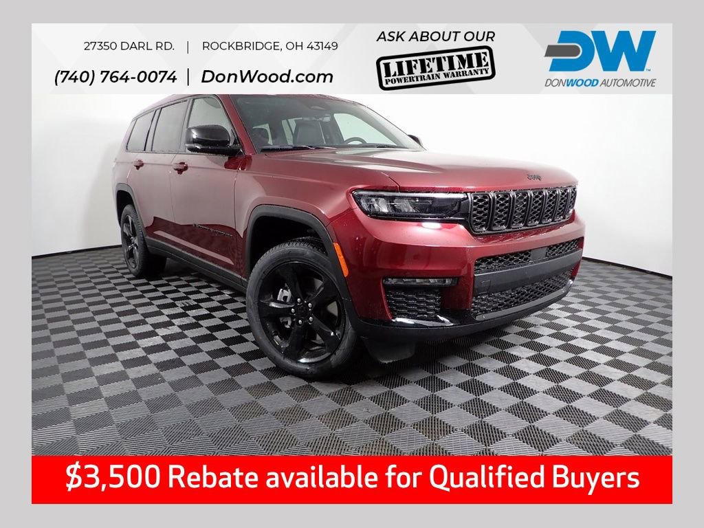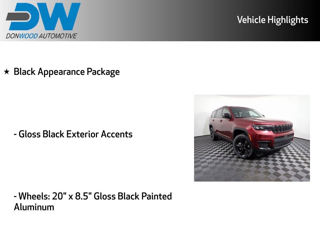 Grand Cherokee L Limited, 4WD, Black Appearance Package, Dual-Pane Panoramic Sunroof, Gloss Black Exterior Accents, Interior Rear Facing Camera, Rear air conditioning, Wheels: 20" x 8.5" Gloss Black Painted Aluminum.