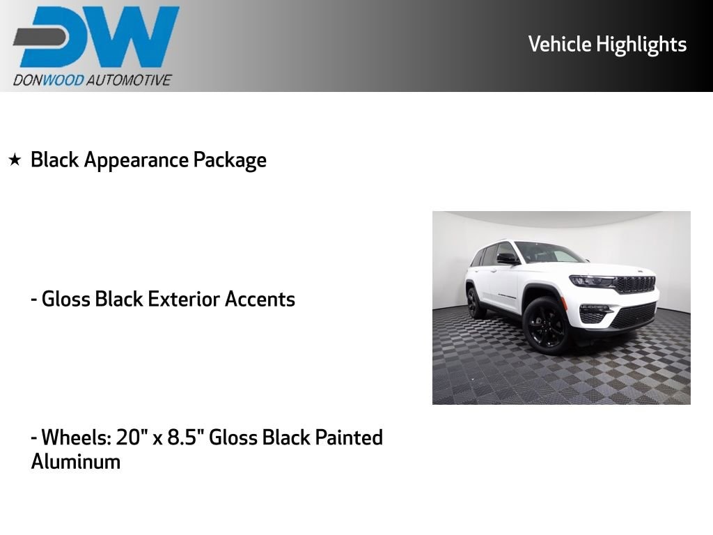 Grand Cherokee Limited, 4WD, AM/FM radio: SiriusXM with 360L, Black Appearance Package, Brake assist, Capri Leatherette Seats, Dual-Pane Panoramic Sunroof, Gloss Black Exterior Accents, Heated steering wheel, Memory seat, ParkView Rear Back-Up Camera, Power driver seat, Speed control, Split folding rear seat, Steering wheel mounted audio controls, Wheels: 20" x 8.5" Gloss Black Painted Aluminum. Price includes the following rebates:$2000 - 2025 National Bonus Cash . Exp. 03/31/2026 $2250 - 2025 National Retail Bonus Cash . Exp. 03/31/2026