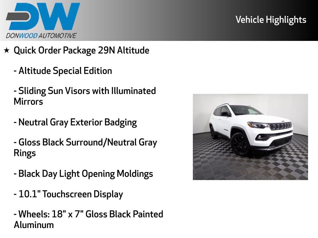Compass Latitude, 4WD, 10.1" Touchscreen Display, Altitude Special Edition, Automatic temperature control, Black Day Light Opening Moldings, Gloss Black Surround/Neutral Gray Rings, Neutral Gray Exterior Badging, ParkView Rear Back-Up Camera, Piano Black Interior Accents, Premium audio system: UConnect 5, Quick Order Package 29N Altitude, Radio: Uconnect 5 with 8.4" Display, Rear window defroster, Remote Keyless Entry, SiriusXM Satellite Radio, Sliding Sun Visors with Illuminated Mirrors, Speed control, Steering wheel mounted audio controls, Wheels: 18" x 7" Gloss Black Painted Aluminum.