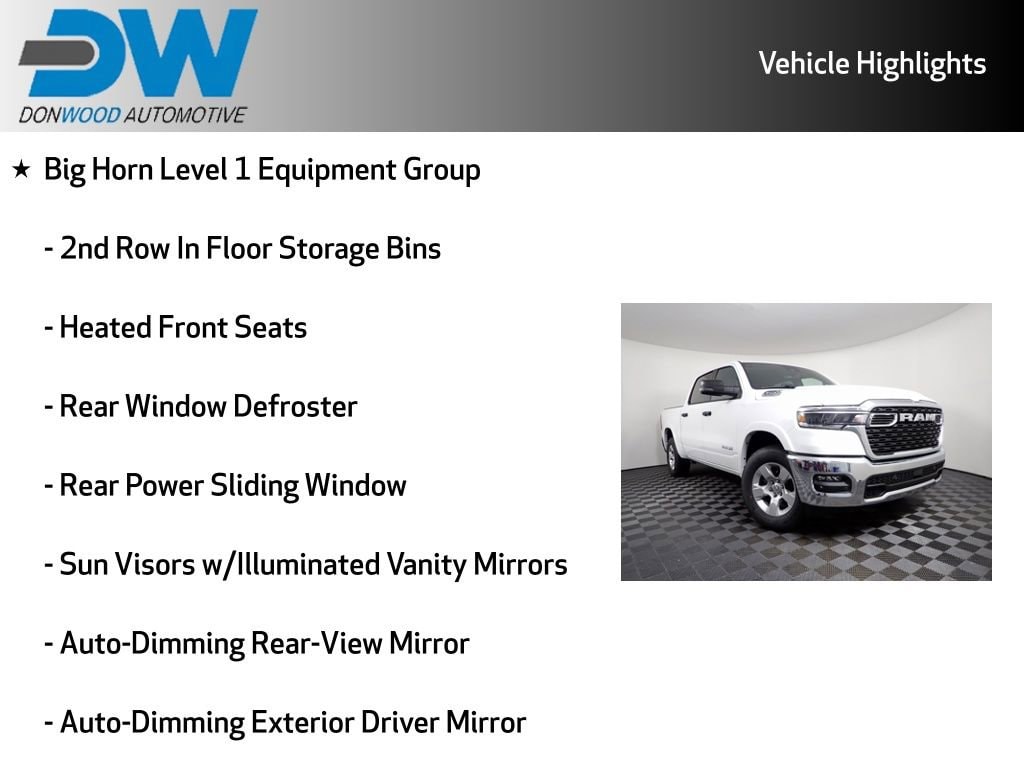 1500 Big Horn/Lone Star, 4WD, 115V Auxiliary Power Outlet, 2nd Row In Floor Storage Bins, 400W Inverter, Auto Power-Folding Mirrors, Auto-Dimming Exterior Driver Mirror, Auto-Dimming Rear-View Mirror, Big Horn Level 1 Equipment Group, Black Exterior Mirrors, Black Premium Power Mirrors, Convex Wide-Angle Exterior Mirror Insert, Electronic Stability Control, Exterior Mirrors Courtesy Lamps, Exterior Mirrors w/Heating Element, Exterior Mirrors w/Supplemental Signals, Glove Box Lamp, Heated Front Seats, Heated Steering Wheel, Leather Wrapped Steering Wheel, Power 2-Way Driver Lumbar Adjust, Power Adjust 8-Way Driver Seat, Power Adjustable Pedals, Radio: Uconnect 5 W w/8.4" Display, Rear Power Sliding Window, Rear step bumper, Rear Window Defroster, Speed control, Steering Wheel Mounted Audio Controls, Sun Visors w/Illuminated Vanity Mirrors, Traction Control, Universal Garage Door Opener, Wheels: 18" x 8" Cast-Aluminum Painted. Price includes the following rebates:$2000 - 2025 National Bonus Cash . Exp. 03/31/2026 10% Msrp - 2025 National 10% Below MSRP . Exp. 03/31/2026