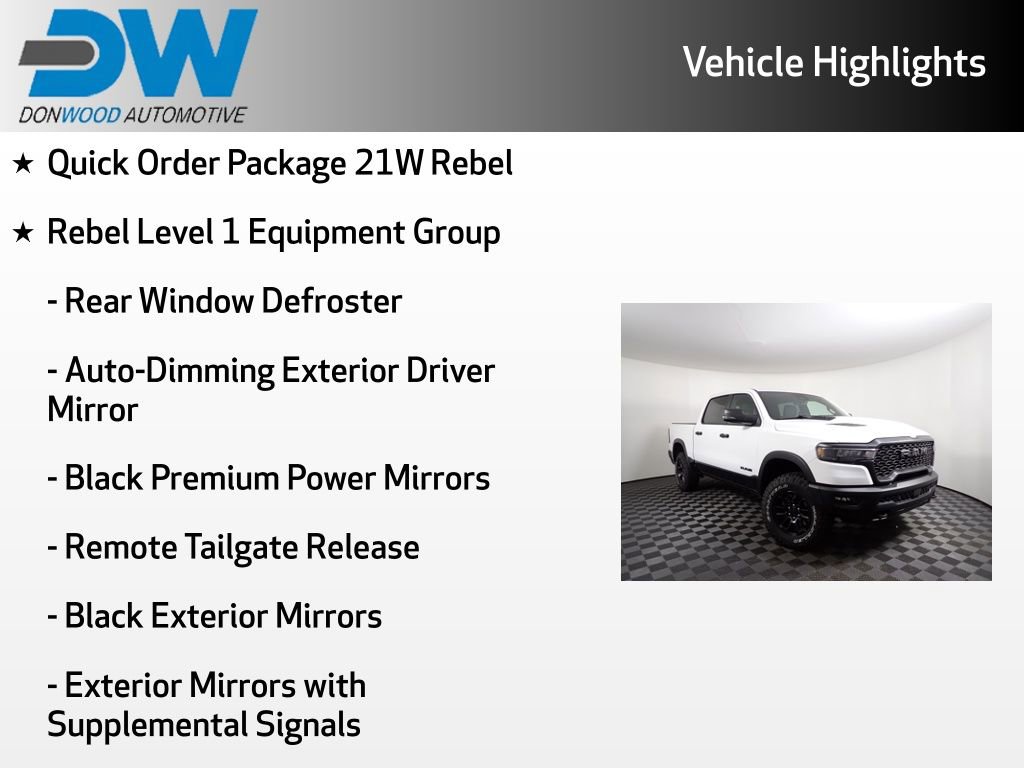 1500 Rebel, 4D Crew Cab, 4WD, 33 Gallon Fuel Tank, Auto Power-Folding Mirrors, Auto-Dimming Exterior Driver Mirror, Black Exterior Mirrors, Black Premium Power Mirrors, Convex Wide-Angle Exterior Mirror Insert, Dual-Zone Automatic Temperature Control, Exterior Mirrors Courtesy Lamps, Exterior Mirrors with Heating Element, Exterior Mirrors with Supplemental Signals, Fully automatic headlights, Heated Front Seats, ParkView Rear Back-Up Camera, Power Adjust 8-Way Driver Seat, Power Adjustable Pedals, Power driver seat, Quick Order Package 21W Rebel, Radio: Uconnect 5 Navigation with 12.0" Display, Rear Window Defroster, Rebel Level 1 Equipment Group, Remote Keyless Entry, Remote Tailgate Release, Speed control, Steering wheel mounted audio controls, Wheels: 18" x 8.0" Painted Mid-Gloss Black, Wireless Charging Pad.