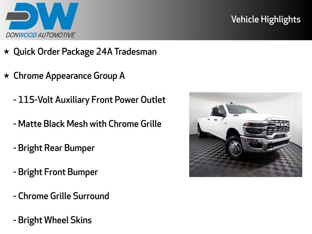 3500 Tradesman, 6.7L I6, 4WD, 40/20/40 Split Bench Seat, 400W Inverter, 50 Gallon Fuel Tank, Apple CarPlay/Android Auto, Black Wheel Center Hub, Bright Front Bumper, Bright Rear Bumper, Bright Wheel Skins, Center Hub, Chrome Appearance Group A, Chrome Grille Surround, Clearance Lamps, Dual Rear Wheels, Electronic Stability Control, Exterior 115V AC Outlet, Nexen Brand Tires, Quick Order Package 24A Tradesman, Rear Folding Seat, Rear Wheelhouse Liners, Remote Keyless Entry, SiriusXM Radio Service, Wheels: 18" x 8.0" Black Painted Steel.