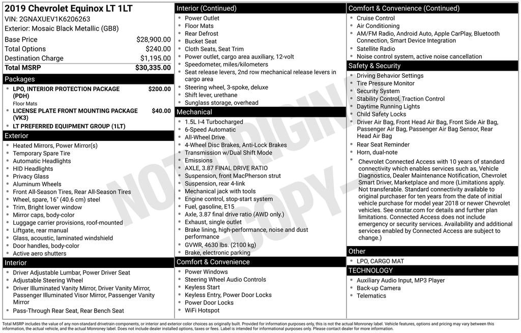 A short drive from Athens, Cambridge, Chillicothe, Circleville, Columbus, Lancaster, Logan, Marietta, Nelsonville, Newark, Pickerington, Pomeroy, and Zanesville in Ohio, as well as Charleston, Clarksburg, Huntington, Morgantown, Parkersburg, Vienna, and Wheeling in West Virginia. 900 East State St. Athens, OH 45701. Near Ohio University! Down the road from Hocking Hills! Vehicle: 2019 Chevrolet Equinox LT Price: 16500 (live market adjusted) CarFax: True, available today Stock#: T206263P | VIN Ending: 2GNAXUEV1K6206263 Delivery: Nationwide delivery available.