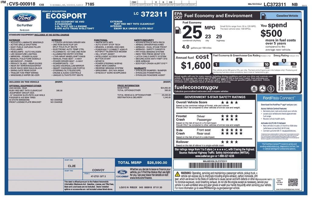Clean CARFAX!, The Ford EcoSport SE is as efficient as it is impressive, achieving, 23 MPG city, 29 MPG hwy & 25 MPG combined drive more, spend less!, The Ford EcoSport SE is packed with everything you need, including, Apple CarPlay, Android Auto, Touchscreen Infotainment, Power Moonroof, Heated Seats, 4-Wheel Drive, Backup Camera, 6 Speakers, Air Conditioning, AppLink/Apple CarPlay and Android Auto, Automatic temperature control, Brake assist, Delay-off headlights, Electronic Stability Control, Exterior Parking Camera Rear, Front Bucket Seats, Front Center Armrest, Fully automatic headlights, Heated front seats, Overhead console, Panoramic Power Moonroof, Radio: AM/FM Stereo w/MP3 Capable, Rear Parking Sensors, Remote Keyless Entry, SiriusXM Radio, Speed-Sensing Steering, Split folding rear seat, Steering wheel mounted audio controls, SYNC 3 Communications & Entertainment System, Traction Control, Wheels: 16 Shadow Silver-Painted Aluminum.At Don Wood Chevrolet, we believe in transparent, live market pricing. Our vehicles are priced using real-time data, so you can shop with confidence knowing youâre getting a competitive value. Whether youâre searching for a Great Deal, a Great Price, or a Great Value, Don Wood Chevy has you covered. Plus, enjoy a complimentary CARFAX® report available today. If we donât have exactly what youâre looking for, just let us know weâll find it for you. We also offer nationwide delivery, making it easy to purchase your next vehicle from anywhere. We have access to virtually any make or model and proudly offer Certified Pre-Owned vehicles as well. We can also locate vehicles with nearly any option, including Sunroof, Moonroof, Navigation System, Heated Steering Wheel, HomeLink, LED Headlights, DVD Player, Rear Seat Entertainment, Backup Camera, Brake Assist, Automatic Emergency Braking, Blind Spot Monitoring, Cross Traffic Alert, Rear Cross Traffic Alert, Lane Departure Warning, Night Vision, Head-Up Display, Automatic Parking, Cruise Control, Adaptive Cruise Control, Rain-Sensing Wipers, Remote Engine Start, Memory Seats, Leather Seats, Heated Seats, Cooled Seats, Third-Row Seating, Steering Wheel Controls, Multi-Zone Climate Control, Keyless Entry, Alloy Wheels, Premium Wheels, Apple CarPlay®, Android AutoTM, WiFi Hotspot, Premium Audio Systems, Bluetooth® Audio, Hands-Free Audio, Portable Audio Connection, Satellite Radio, Trailer Tow Package, Tow Hitch, 4WD, AWD, FWD, Disability-Equipped Vehicles, Keyless Start, Security System, Roof Rack, Dual Rear Wheels, Stability Control, and much more!A short drive from Athens, Cambridge, Chillicothe, Circleville, Columbus, Lancaster, Logan, Marietta, Nelsonville, Newark, Pickerington, Pomeroy, and Zanesville in Ohio, as well as Charleston, Clarksburg, Huntington, Morgantown, Parkersburg, Vienna, and Wheeling in West Virginia. 12916 Ohio State Route 664 Logan, OH 43138. Located in the Hocking Hills! Close to Ohio University! Vehicle: 2020 Ford EcoSport SE Price: 15000 (live market adjusted) CarFax: True, available today Stock#: C164805PAT | VIN Ending: MAJ6S3GL2LC372311 Delivery: Nationwide delivery available.