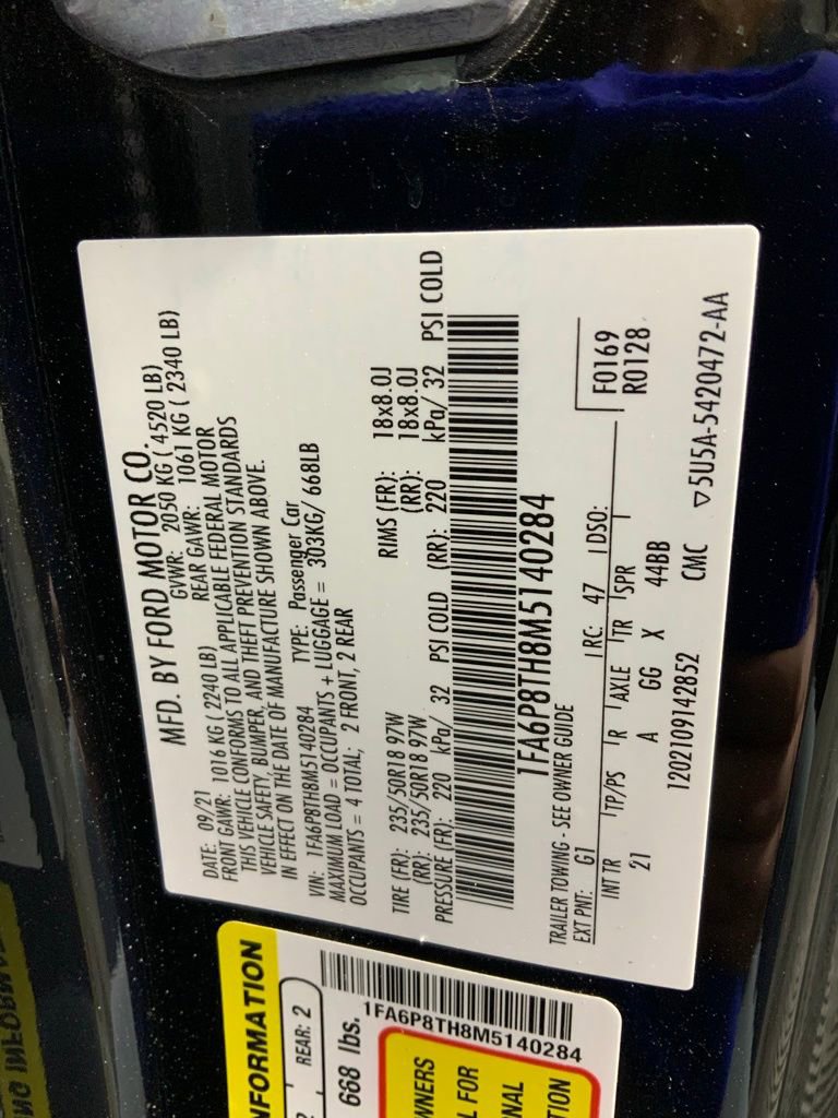 Clean CARFAX! CARFAX One-Owner! SYNC With AppLink, Intelligent Access With Push-Button Start, Ford Co-Pilot360, Rear View Camera, Track Apps, Leather-Wrapped Steering Wheel With Cruise And Audio Controls, Auto-Dimming Rearview Mirror, Cloth Seating Surfaces, Power Driver And Passenger Windows With One-Touch Up And Down, Power Door Locks, Split Fold Rear Seat, Center Console With Armrest, Front Floor Mats, Dual Illuminated Vanity Mirrors, Smart Charging USB Ports, 12-Volt Powerpoints, Manual Air Conditioning With Single-Zone Control, Tilt And Telescoping Steering Column, Windows With Global Open, AdvanceTrac Electronic Stability Control, Limited Slip Rear Axle, Independent Rear Suspension, Electronic Power-Assist Steering, Anti-Lock Braking System, Brake Assist, Driver And Passenger Knee Airbags, Dual-Stage Front Airbags, Front Seat-Mounted Side-Impact Airbags, Side Air Curtain Airbags, LATCH Child Safety System, Individual Tire Pressure Monitoring System, Perimeter Alarm, Securilock Passive Anti-Theft System, SOS Post-Crash Alert System, LED Headlamps With Signature Lighting, Autolamp Headlamps With On And Off Control, LED Taillamps With Sequential Turn Signal, Rain-Sensing Windshield Wipers, Hood Vents, Power Glass Exterior Mirrors With Manual Fold, Easy Fuel Capless Filler, MyKey System, 4.2-Inch LCD Center Stack Screen, AM/FM Stereo With Six Speakers, 2.3L EcoBoost Engine Producing 310 Horsepower, Six-Speed Manual Transmission, Rear-Wheel Drive., 4-Wheel Disc Brakes, Air Conditioning, Alloy wheels, AM/FM Stereo, Auto High-beam Headlights, Auto-dimming Rear-View mirror, Brake assist, Dual front impact airbags, Dual front side impact airbags, Electronic Stability Control, Emergency Communication System: 911 Assist, Exterior Parking Camera Rear, Four wheel independent suspension, Front Bucket Seats, Front Center Armrest, Fully automatic headlights, Leather Shift Knob, Low Tire Pressure Warning, Outside temperature display, Overhead console, Panic Alarm, Power door mirrors, Power windows, Radio data system, Rain Sensing Wipers, Remote Keyless Entry, Security System, Speed control, Speed-Sensing Steering, Speed-Sensitive Wipers w/Heated Jets, Split folding rear seat, SYNC 3 Communications & Entertainment System, SYNC Communications & Entertainment System, Tilt Steering Wheel, Traction Control, Trip Computer, Wheels: 18 Machined Aluminum High Gloss Black Wheels.At Don Wood Ford Lincoln, we believe in transparent, live market pricing. Our vehicles are priced using real-time data, so you can shop with confidence knowing youâre getting a competitive value. Whether youâre searching for a Great Deal, a Great Price, or a Great Value, Don Wood Ford Lincoln has you covered. Plus, enjoy a complimentary CARFAX® report available today. If we donât have exactly what youâre looking for, just let us know weâll find it for you. We offer nationwide delivery, making it easy to purchase your next vehicle from anywhere. We have access to virtually any make or model and proudly offer Certified Pre-Owned vehicles as well. We can also locate vehicles with nearly any option, including Sunroof, Moonroof, Navigation System, Heated Steering Wheel, HomeLink, LED Headlights, DVD Player, Rear Seat Entertainment, Backup Camera, Brake Assist, Automatic Emergency Braking, Blind Spot Monitoring, Cross Traffic Alert, Rear Cross Traffic Alert, Lane Departure Warning, Night Vision, Head-Up Display, Automatic Parking, Cruise Control, Adaptive Cruise Control, Rain-Sensing Wipers, Remote Engine Start, Memory Seats, Leather Seats, Heated Seats, Cooled Seats, Third-Row Seating, Steering Wheel Controls, Multi-Zone Climate Control, Keyless Entry, Alloy Wheels, Premium Wheels, Apple CarPlay®, Android AutoTM, WiFi Hotspot, Premium Audio Systems, Bluetooth® Audio, Hands-Free Audio, Portable Audio Connection, Satellite Radio, Trailer Tow Package, Tow Hitch, 4WD, AWD, FWD, Disability-Equipped Vehicles, Keyless Start,
