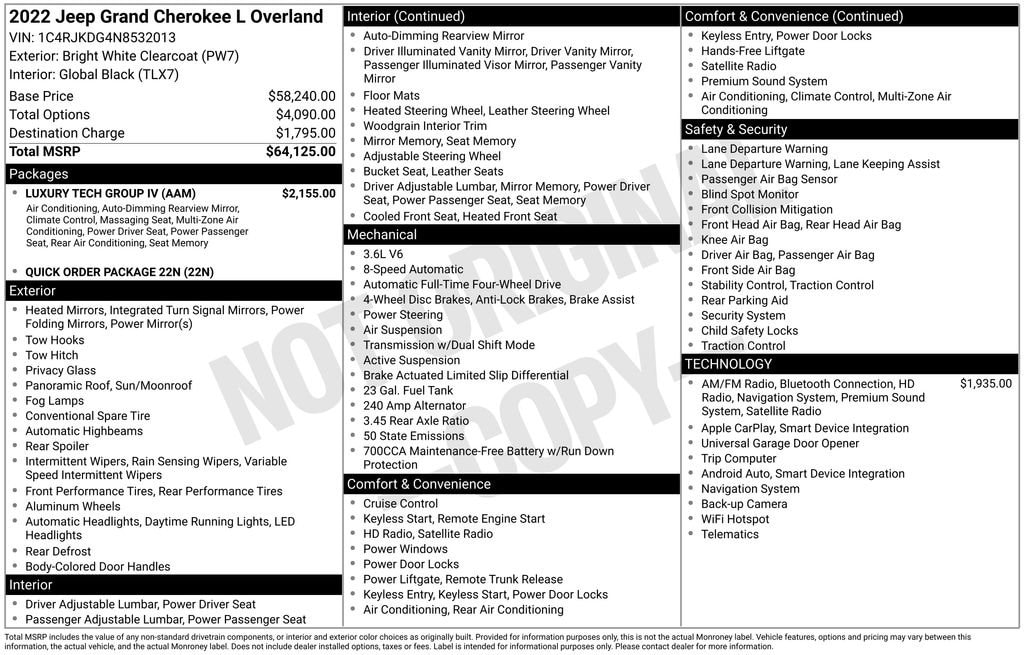 Clean One-Owner CARFAX! Apple CarPlay, Google Android Auto, Uconnect 5 Nav with 10.1 Inch Touch Screen Display, Heated Front Seats, Ventilated Front Seats, Heated Second Row Seats, Nappa Leather Seats, Power Driver Seat with Back Massager, Power Front Passenger Seat with Back Massager, Driver Seat Memory, 2nd Row Buckets with Manual Easy Entry Slide, 3rd Row 50/50 Power Folding Seat, Heated Steering Wheel, Three Zone Automatic Temperature Control, Four Zone Automatic Temperature Control, Wireless Charging Pad, Hands Free Power Liftgate, Remote Start System, Universal Garage Door Opener, Auto Dimming Rear View Mirror, Adaptive Cruise Control with Stop and Go, Active Lane Management System, Full Speed Forward Collision Warning Plus, Pedestrian and Cyclist Emergency Braking, ParkView Rear Back Up Camera, ParkSense Front and Rear Park Assist with Stop, Blind Spot and Cross Path Detection, Advanced Brake Assist, Rear Seat Object Alert, Hill Start Assist, Hill Descent Control, Security Alarm, Quadra Trac II 4WD System, Selec Terrain System, Quadra Lift Air Suspension, Semi Active Damping, Trailer Tow Package, Electronic Stability Control, Tire Pressure Monitoring Display, Bi Function LED Projector Headlamps, 20 Inch Machined Face Aluminum Wheels, Manual 2nd Row Window Shades, Full Size Spare Tire, Deep Tint Sunscreen Glass, and LED Lighting Elements..