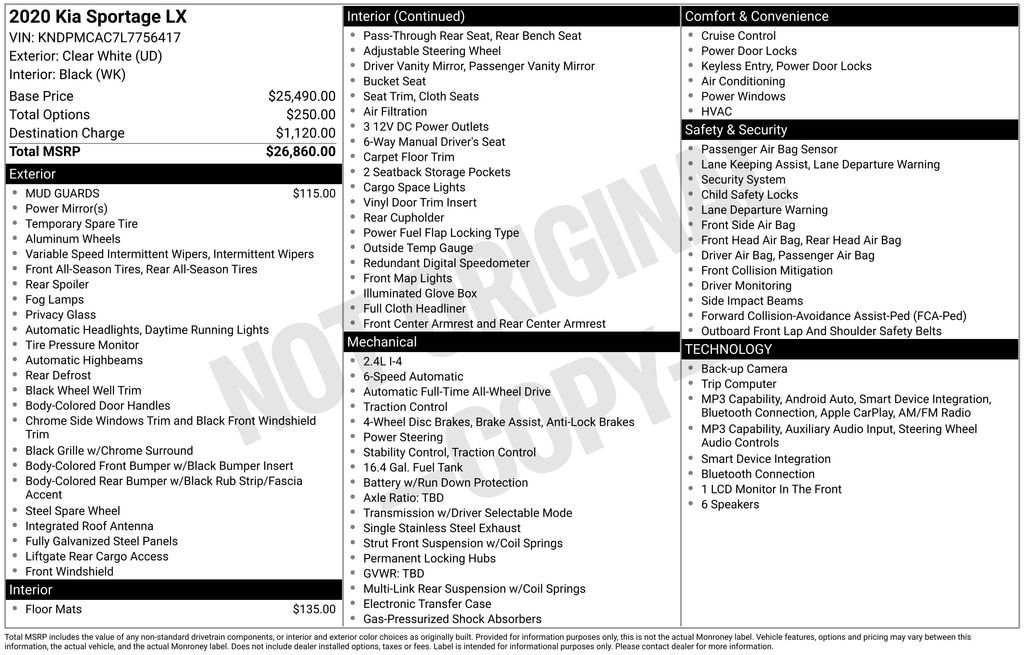 Clean CARFAX!, Apple CarPlay, Lane Keep Assist, All-Wheel Drive, 17 Machine-Finished Alloy Wheels, 6-Way Manual Driver's Seat, Air Conditioning, Apple CarPlay & Android Auto, Auto High-beam Headlights, Brake assist, Electronic Stability Control, Exterior Parking Camera Rear, Front Bucket Seats, Fully automatic headlights, Speed control, Split folding rear seat, Steering wheel mounted audio controls.At Don Wood Chevrolet, we believe in transparent, live market pricing. Our vehicles are priced using real-time data, so you can shop with confidence knowing youâre getting a competitive value. Whether youâre searching for a Great Deal, a Great Price, or a Great Value, Don Wood Chevy has you covered. Plus, enjoy a complimentary CARFAX® report available today. If we donât have exactly what youâre looking for, just let us know weâll find it for you. We also offer nationwide delivery, making it easy to purchase your next vehicle from anywhere. We have access to virtually any make or model and proudly offer Certified Pre-Owned vehicles as well. We can also locate vehicles with nearly any option, including Sunroof, Moonroof, Navigation System, Heated Steering Wheel, HomeLink, LED Headlights, DVD Player, Rear Seat Entertainment, Backup Camera, Brake Assist, Automatic Emergency Braking, Blind Spot Monitoring, Cross Traffic Alert, Rear Cross Traffic Alert, Lane Departure Warning, Night Vision, Head-Up Display, Automatic Parking, Cruise Control, Adaptive Cruise Control, Rain-Sensing Wipers, Remote Engine Start, Memory Seats, Leather Seats, Heated Seats, Cooled Seats, Third-Row Seating, Steering Wheel Controls, Multi-Zone Climate Control, Keyless Entry, Alloy Wheels, Premium Wheels, Apple CarPlay®, Android AutoTM, WiFi Hotspot, Premium Audio Systems, Bluetooth® Audio, Hands-Free Audio, Portable Audio Connection, Satellite Radio, Trailer Tow Package, Tow Hitch, 4WD, AWD, FWD, Disability-Equipped Vehicles, Keyless Start, Security System, Roof Rack, Dual Rear Wheels, Stability Control, and much more!A short drive from Athens, Cambridge, Chillicothe, Circleville, Columbus, Lancaster, Logan, Marietta, Nelsonville, Newark, Pickerington, Pomeroy, and Zanesville in Ohio, as well as Charleston, Clarksburg, Huntington, Morgantown, Parkersburg, Vienna, and Wheeling in West Virginia. 12916 Ohio State Route 664 Logan, OH 43138. Located in the Hocking Hills! Close to Ohio University! Vehicle: 2020 Kia Sportage LX Price: 13680 (live market adjusted) CarFax: True, available today Stock#: C218144AT | VIN Ending: KNDPMCAC7L7756417 Delivery: Nationwide delivery available.