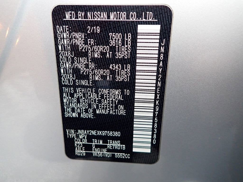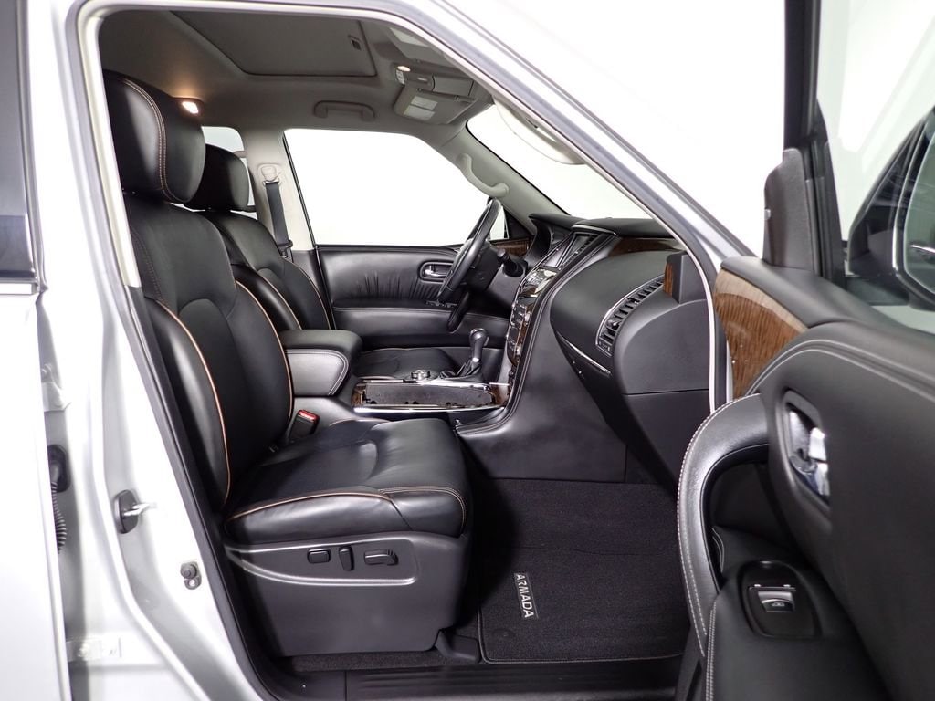 CARFAX One-Owner! This Nissan Armada Platinum has many features and is well equipped including, Power Moonroof, Heated Steering Wheel, Heated Seats, Ventilated Seats, Leather Seats, Remote Vehicle Start, Captain's Chairs, Navigation, Great Price, Backup Camera, Adaptive Cruise Control, Blind Spot Monitoring, Power Liftgate, 4-Wheel Drive, 13 Speakers, 2nd Row Captain's Chairs, 2nd Row Center Console w/ Padded Armrest, 3rd row seats: split-bench, A/V remote, Air Conditioning, Auto tilt-away steering wheel, Auto-dimming door mirrors, Auto-dimming Rear-View mirror, Auto-leveling suspension, Captain's Chairs Package, Carpeted Floor Mats w/ Captain Seat Package, Dual-Zone Automatic Temperature Control, Front Bucket Seats, Front Center Armrest, Fully automatic headlights, Garage Door Transmitter: HomeLink, Headphones, Heated & Cooled Front Bucket Seats w/Driver Memory, Heated door mirrors, Heated front seats, Heated Rear Seats, Heated steering wheel, Leather Shift Knob, Leather-Appointed Seat Trim, Memory seat, Navigation System, Outside temperature display, Panoramic Power Moonroof, Power driver seat, Power Liftgate, Power passenger seat, Radio: AM/FM/SXM/CD/MP3/HD, Rain Sensing Wipers, Rear air conditioning, Rear reading lights, Reclining 3rd row seat, Remote Keyless Entry, Speed-Sensitive Wipers w/Heated Jets, Split folding rear seat, Steering wheel mounted audio controls, Ventilated front seats, Wheels: 20 Machine-Faced Chrome w/Tinted CC.