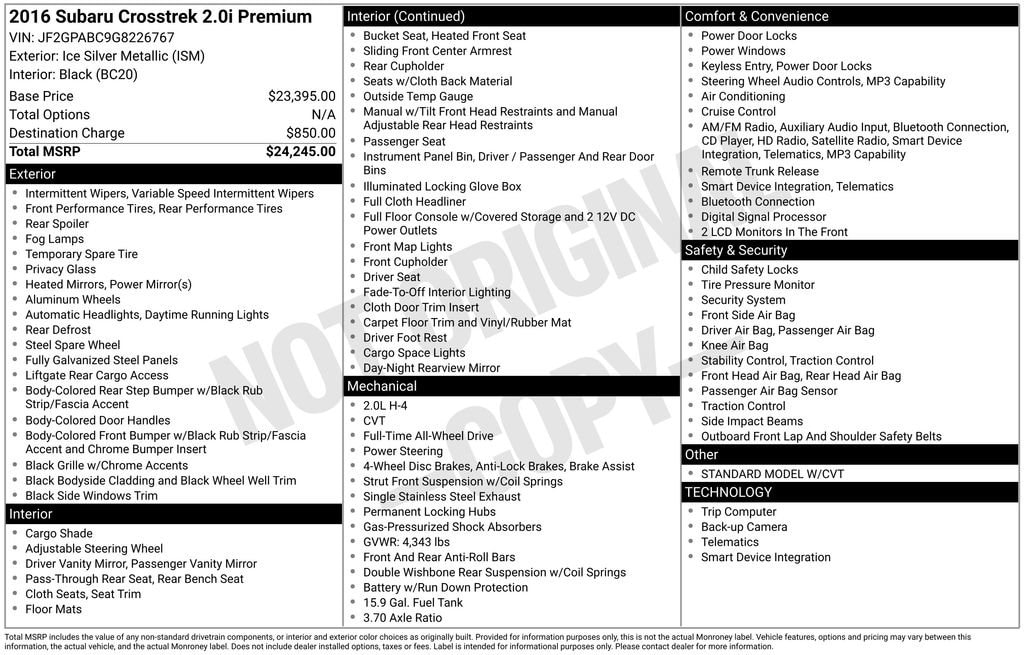Clean CARFAX! Subaru Starlink 6.2-Inch Multimedia System Radio, Subaru Starlink Smartphone Integration, 6 Speakers, Digital Signal Processor, Radio With Seek-Scan Clock And Steering Wheel Controls, 2 LCD Monitors In The Front, Integrated Roof Antenna, Heated Front Bucket Seats, Cloth Upholstery, Seats With Cloth Back Material, Manual With Tilt Front Head Restraints And Manual Adjustable Rear Head Restraints, Rear Vision Camera, FOB Controls Including Cargo Access, Systems Monitor, Outside Temperature Gauge, Analog Appearance, Instrument Panel Bin Driver And Passenger And Rear Door Bins, Cargo Space Lights, Cargo Features Including Cargo Tray And Organizer, Low Tire Pressure Warning, Outboard Front Lap And Shoulder Safety Belts Including Rear Center 3 Point With Height Adjusters And Pretensioners, Rear Child Safety Locks, Driver Knee Airbag, Airbag Occupancy Sensor, Curtain 1st And 2nd Row Airbags, Dual Stage Driver And Passenger Front Airbags, Dual Stage Driver And Passenger Seat-Mounted Side Airbags, Side Impact Beams, Auto Off Aero-Composite And Reflector Halogen Daytime Running Headlamps, Roof Rack Rails Only, Black Grille With Chrome Accents, Liftgate Rear Cargo Access, Fixed Rear Window With Wiper And Defroster, Deep Tinted Glass, Fully Galvanized Steel Panels, Steel Spare Wheel, Electric Power-Assist Speed-Sensing Steering, Front And Rear Anti-Roll Bars, Gas-Pressurized Shock Absorbers, Single Stainless Steel Exhaust, 15.9 Gallon Fuel Tank, Battery With Run Down Protection, Permanent Locking Hubs, Full-Time All-Wheel Drive, 2.0-Liter 16-Valve DOHC Engine, Lineartronic Continuously Variable Transmission With Steering Wheel Paddle-Shift Control Switches And 6-Speed Manual Mode Function, 3.70 Axle Ratio. This versatile crossover delivers smartphone integration through the Starlink multimedia system while heated front seats provide comfort during cold weather, and the full-time all-wheel-drive system with paddle shifters offers confident handling and driver engagement across various road conditions..