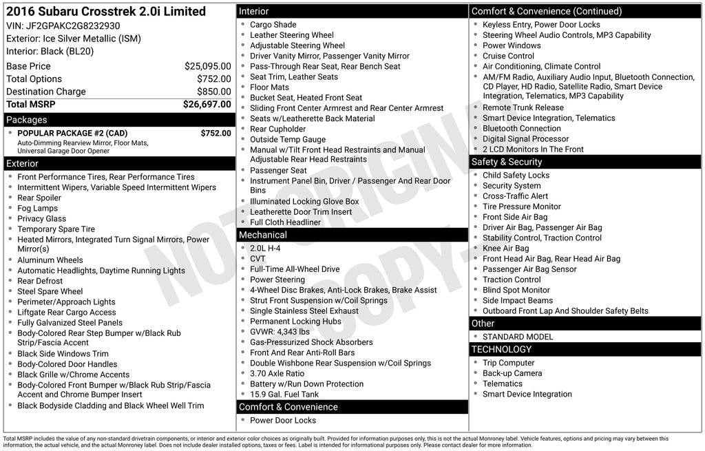 A short drive from Athens, Cambridge, Chillicothe, Circleville, Columbus, Lancaster, Logan, Marietta, Nelsonville, Newark, Pickerington, Pomeroy, and Zanesville in Ohio, as well as Charleston, Clarksburg, Huntington, Morgantown, Parkersburg, Vienna, and Wheeling in West Virginia. 900 East State St. Athens, OH 45701. Near Ohio University! Down the road from Hocking Hills! Vehicle: 2016 Subaru Crosstrek 2.0i Limited Price: 13980 (live market adjusted) CarFax: True, available today Stock#: T12E042AT | VIN Ending: JF2GPAKC2G8232930 Delivery: Nationwide delivery available.